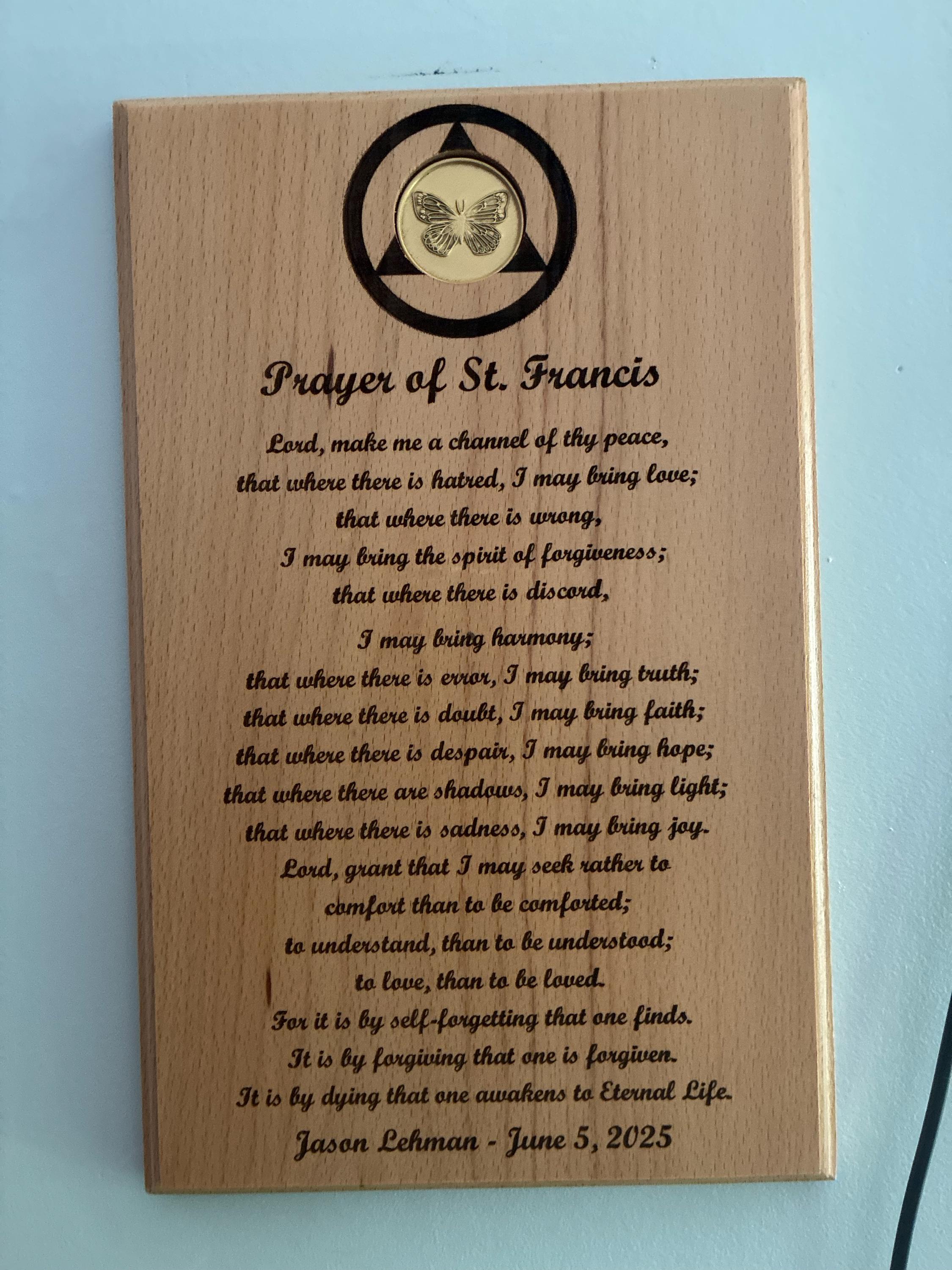 The Prayer of St. Francis engraved onto a solid Beechwood plaque. It is a wonderful gift for anyone in recovery. It measures 7 inches wide by 12 inches long. It was a semi-gloss finish, and I've included the mounting hardware for hanging on the wall. If you would like something personalized on it, such as name and sobriety date, or if you would like me to add a spot to hold a sobriety coin (unless specified, I will not cut the hole), there is no additional charge . Each one is made to order.