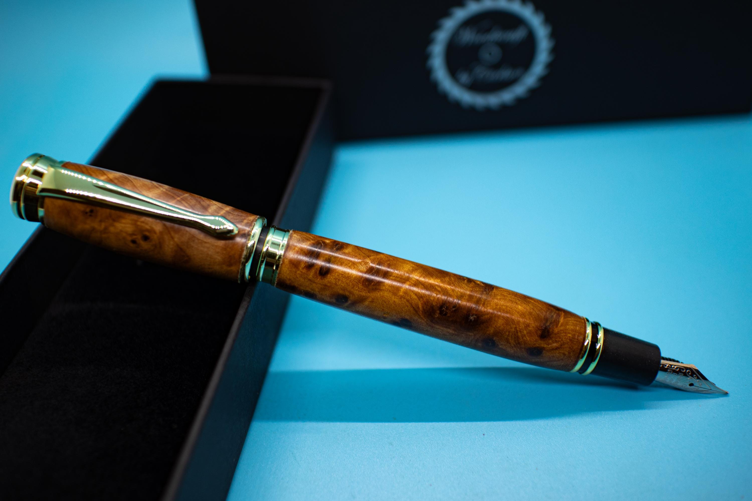Elevate your writing experience with this stunning Thuya Burl Fountain Pen, a handcrafted wood calligraphy pen that combines natural beauty with luxurious functionality. Featuring a rich, warm Thuya Burl wood body, each pen is uniquely crafted, showcasing intricate grain patterns that make it a one-of-a-kind piece. The elegant gold accents and magnetic cap add a touch of sophistication, making it the perfect gift for writers, artists, and calligraphy enthusiasts.
